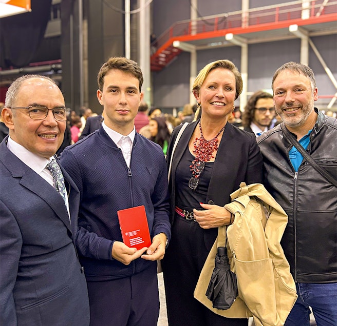 De g. à dr. : Stefano Fanari, Responsable de la commission de formation, Jay Ratoen, apprenti chez Eldora, Susanne Welle, directrice de l’Ecole Hôtelière de Genève et Rodolphe Collet, Responsable de la formation continue.